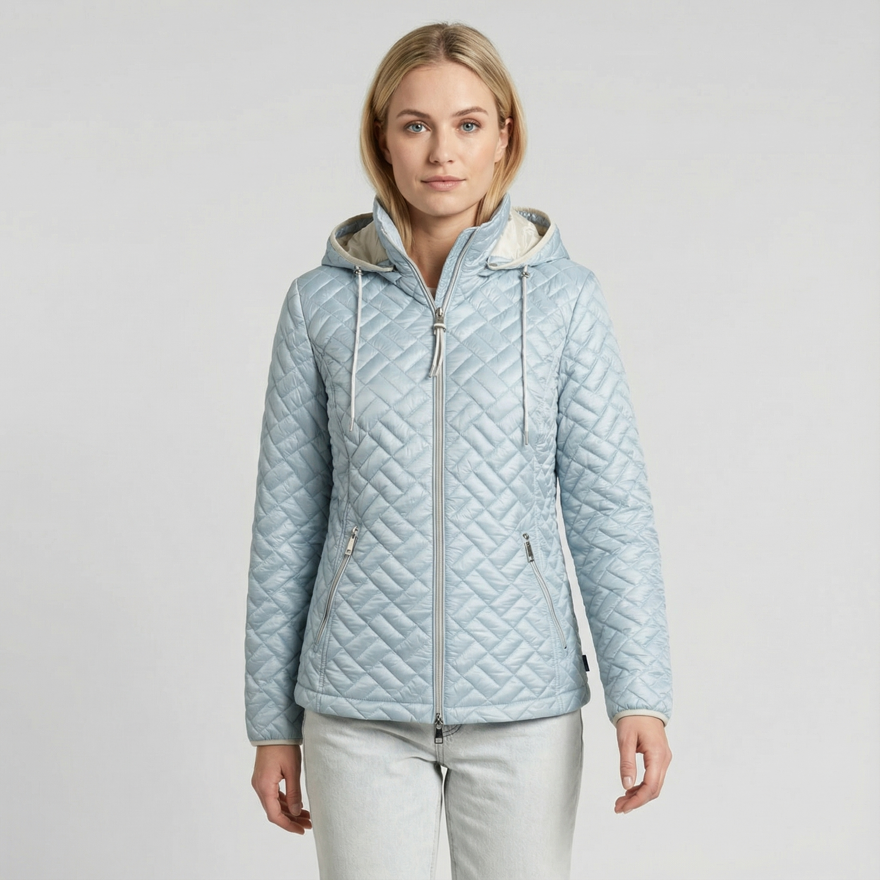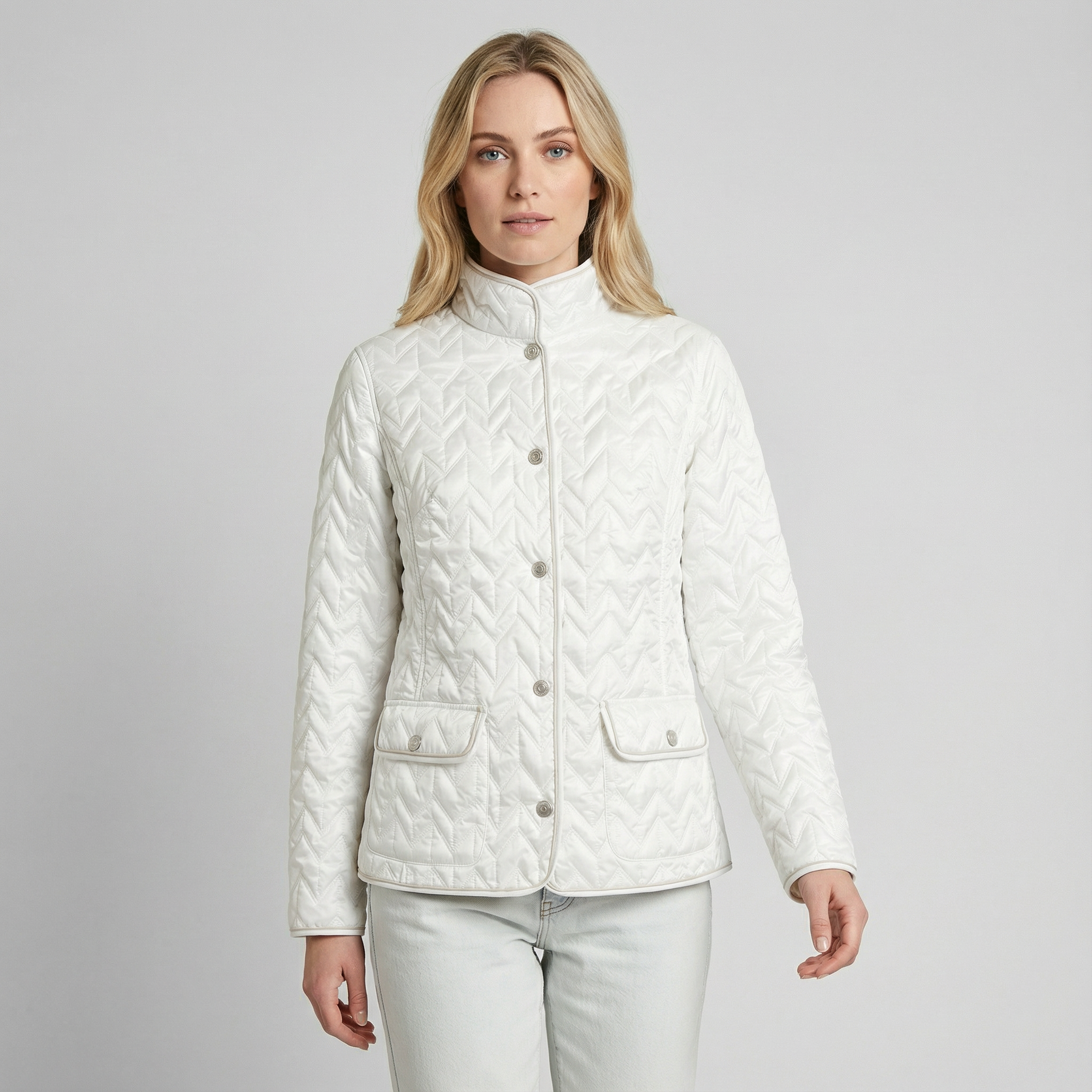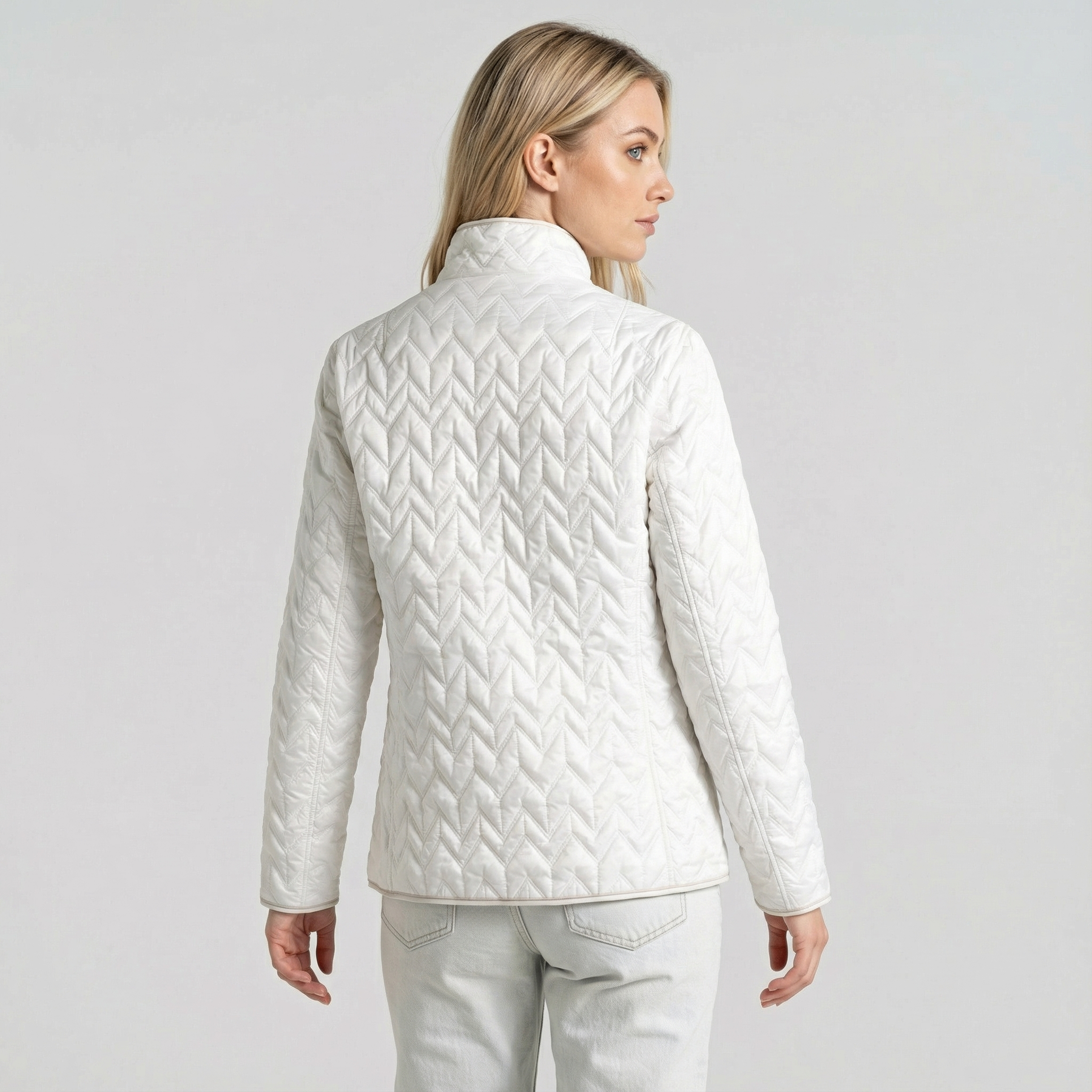 Featuring a contemporary diamond quilt pattern and a flattering tailored silhouette, this jacket provides warmth without bulk—making it an essential layering piece for spring, autumn, and mild winter days.