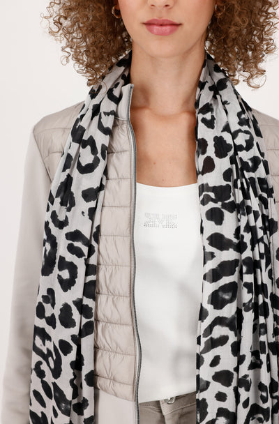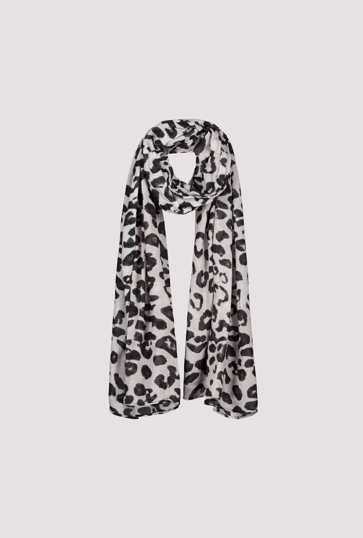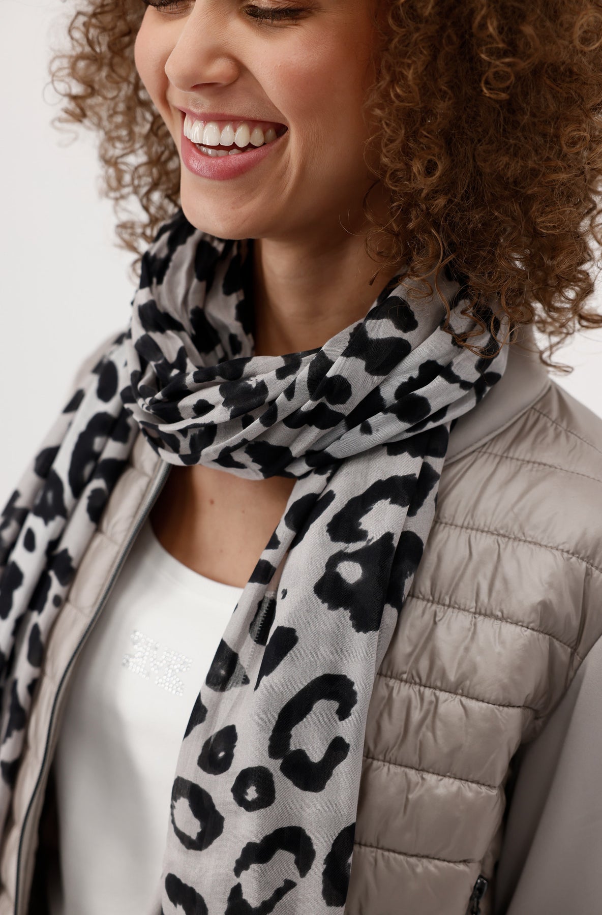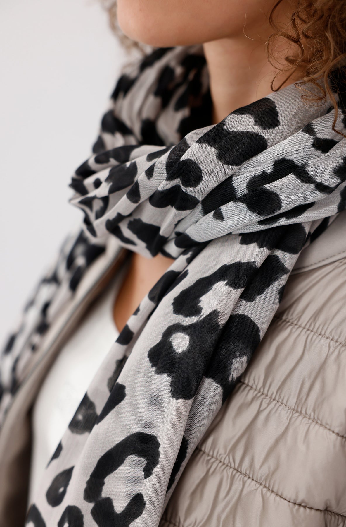 Crafted from a soft knit fabric, this cosy crew neck pullover features a chic animal print pattern in contrasting shades of black, grey, and cream for a bold yet sophisticated look.