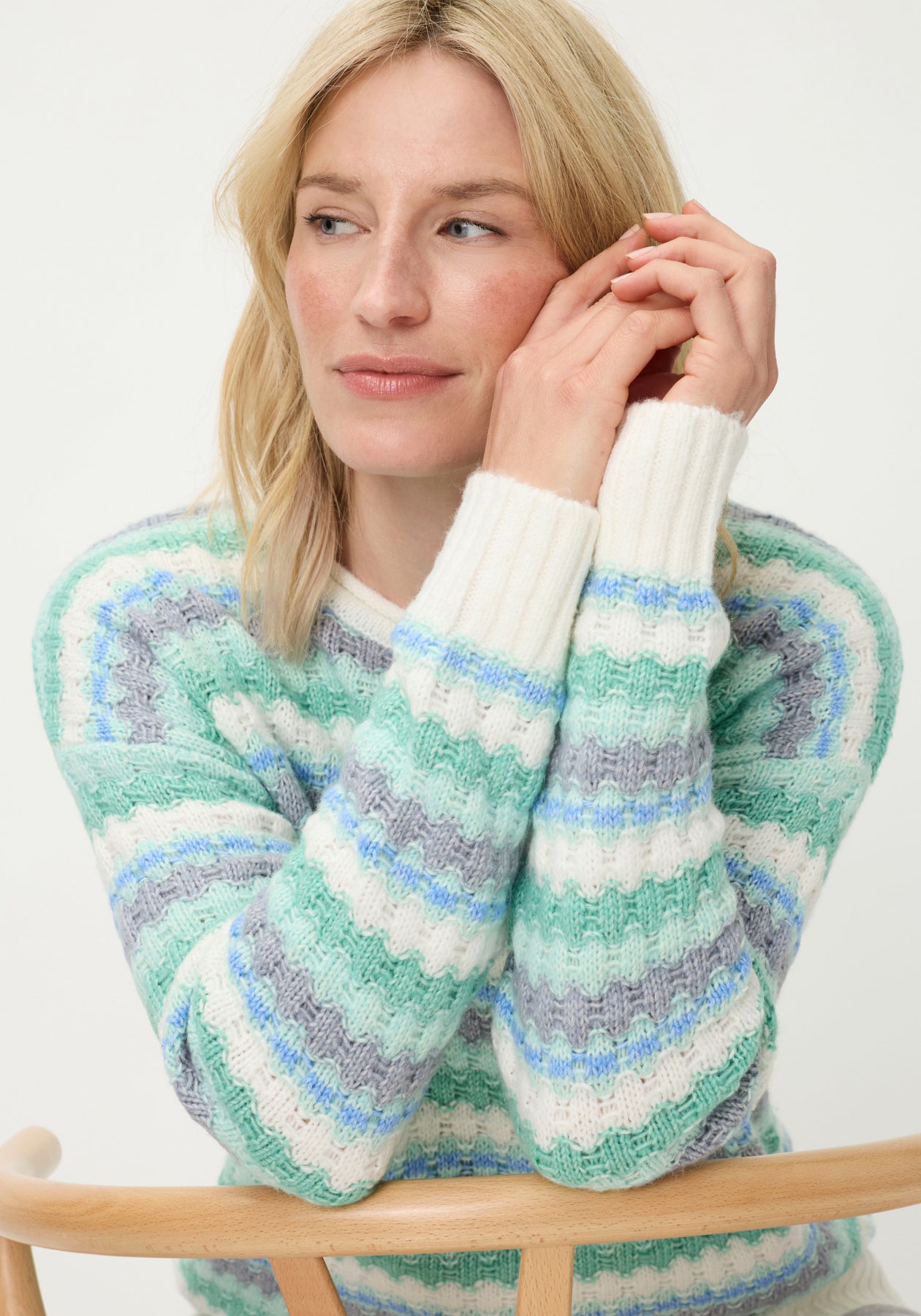 Styled here in a soft light blue, this jumper pairs beautifully with neutral trousers, denim, or layered over a simple top for easy everyday elegance.