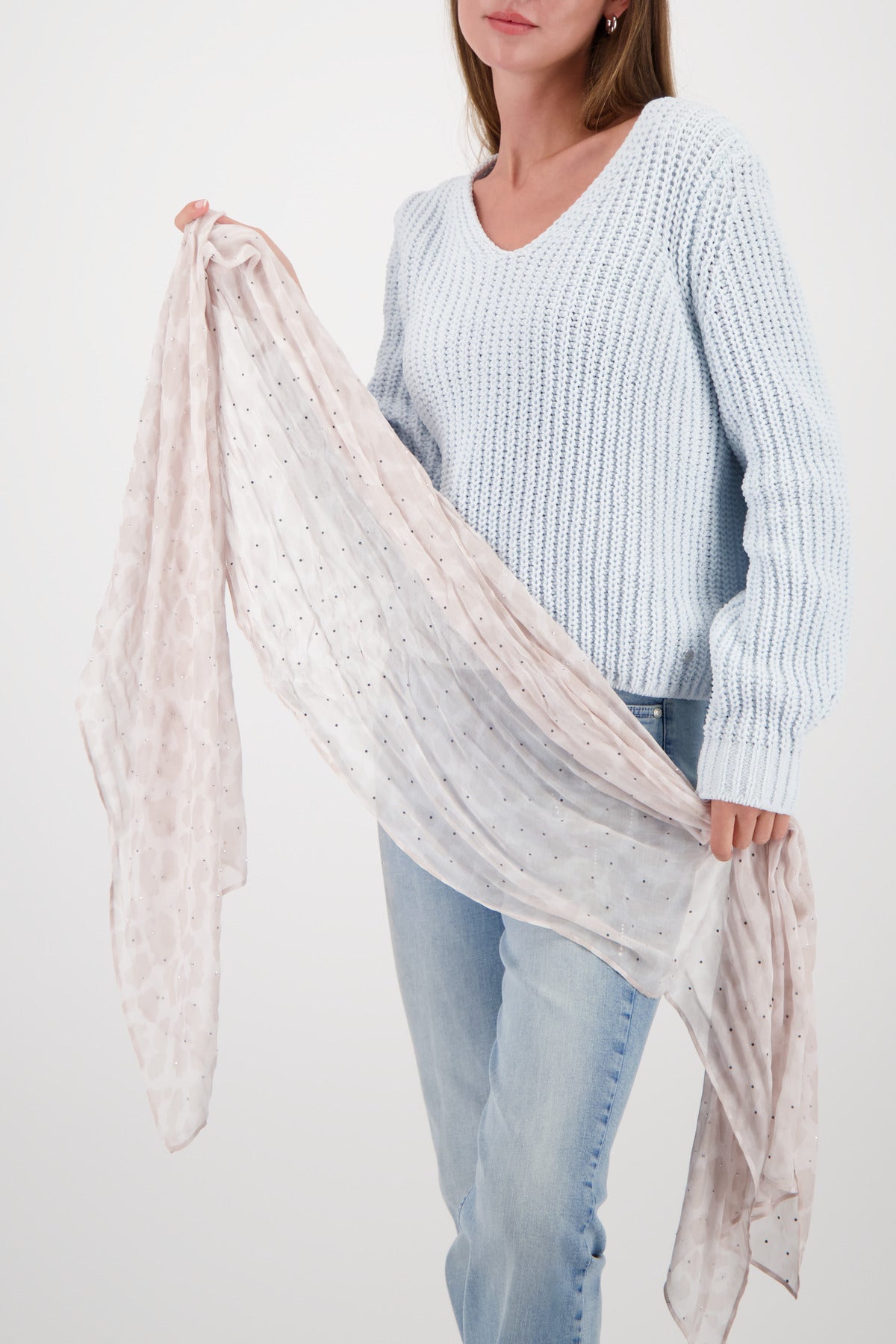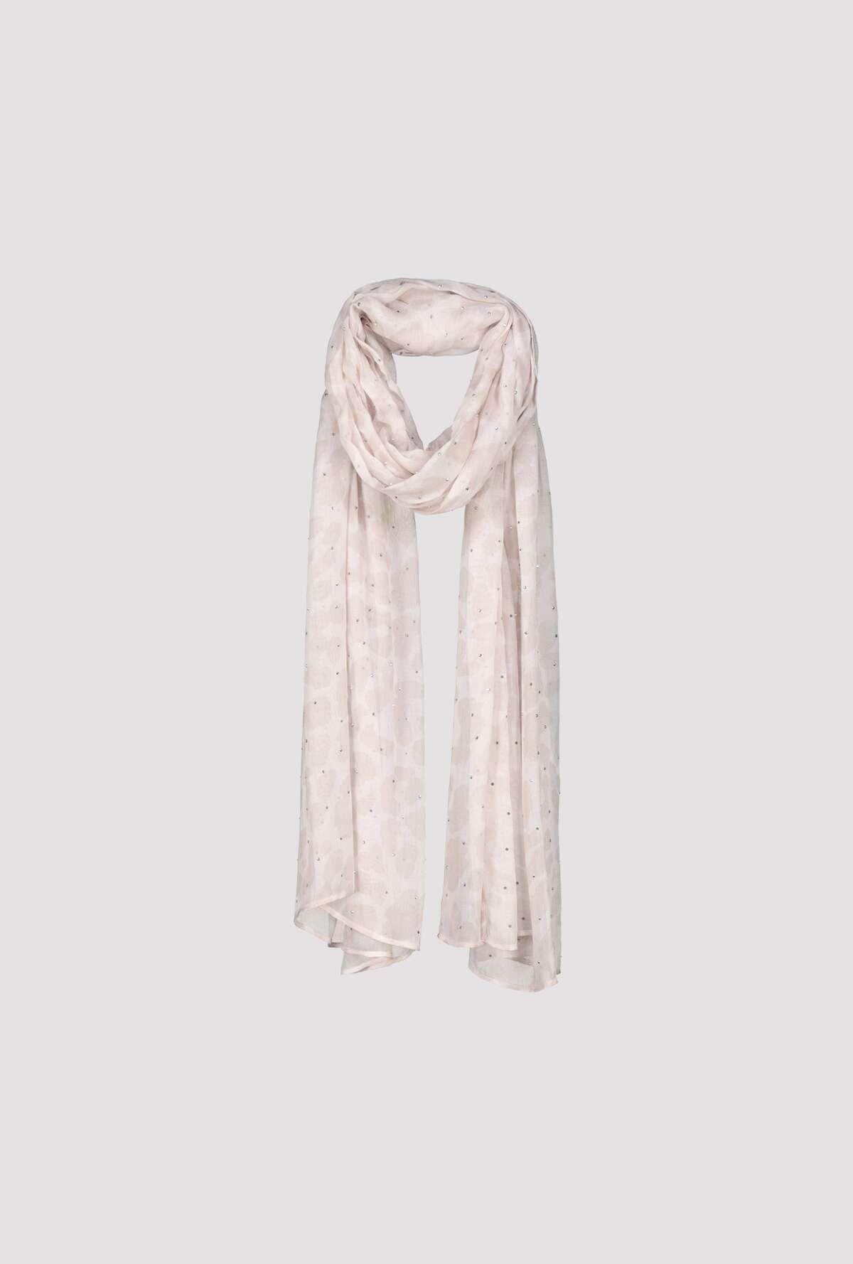 Designed with a beautiful blend of light blue, blush pink, and grey tones, this scarf features a dreamy combination of abstract polka dots and a subtle animal print, making it the perfect accent piece for any outfit.